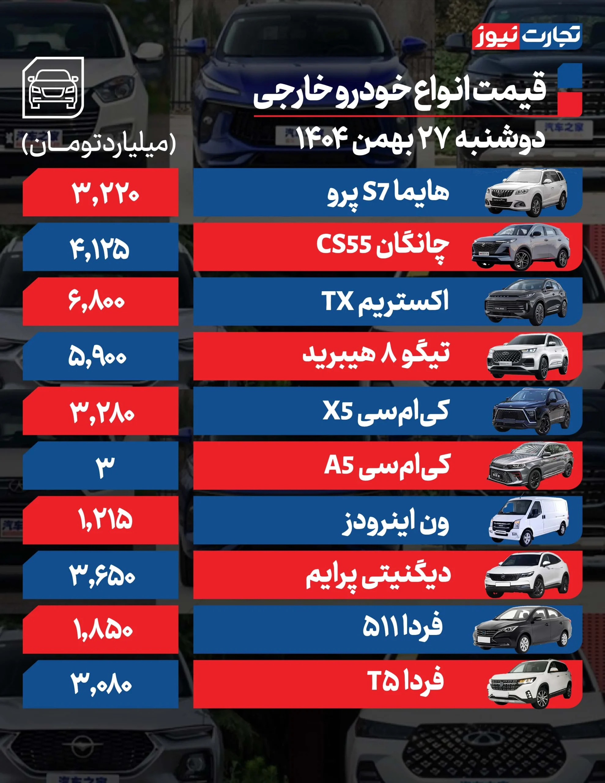 اکستریم TX نسبت به روز معاملاتی پیشین 20 میلیون تومان ارزان شد و به بهای معاملاتی 6 میلیارد و 800 میلیون تومان رسید. از طرف دیگر، تیگو 8 هیبرید 20 میلیون تومان ارزان شد تا با نرخ پنج میلیارد و 900 میلیون تومان در بازار آزاد عرضه شود.