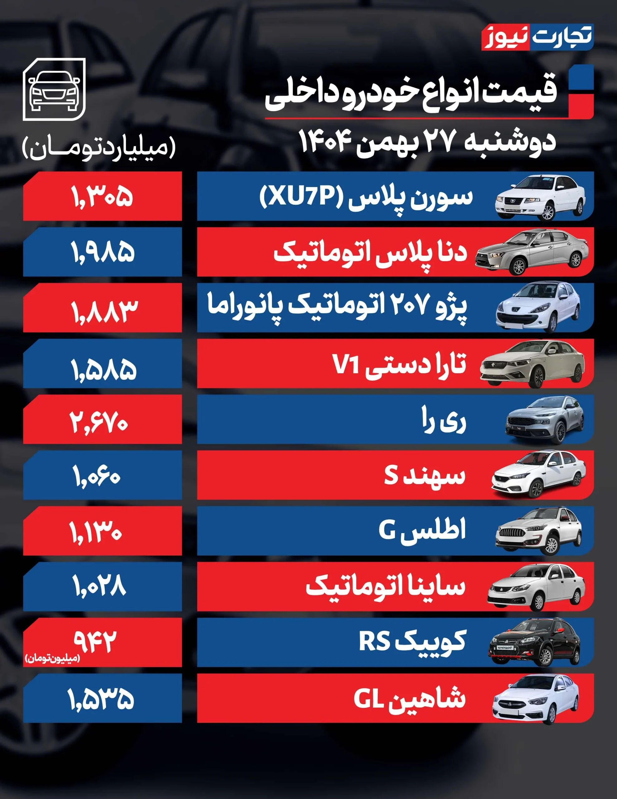 قیمت خودرو امروز 27 بهمن 1404 + جدول