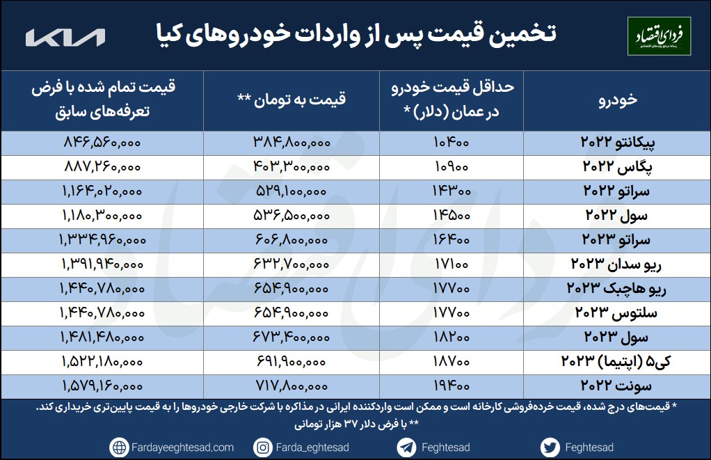 با توجه به آنکه واردات قرار است از مبدا عمان انجام شود، مبنای قیمت هم نرخ فروش این خودروها در این کشور خواهد بود. نگاهی به سایتهای فروش خودروی عمان نشان میدهد که برخی خودروهای کیا ساخت ۲۰۲۲ را میتوان در محدوده بین ۱۰ الی ۱۵ هزار دلار پیدا کرد. هر چند تمام مدلهای ۲۰۲۳، قیمتی بیش از ۱۵ هزار دلار دارند. با فرض آنکه واردکننده رسمی این برند قرار است خودروهای بین ۱۵ تا ۲۰ هزار دلار وارد کند، احتمالا شاهد واردات مدلهای ۲۰۲۳ این خودروها خواهیم بود. در جدول پایین قیمت خودروهای کیا در کشور عمان (مبدا واردات) آمده است.