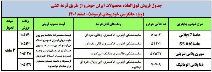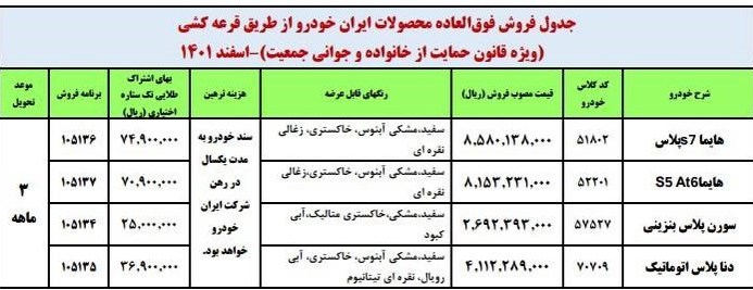 به اطلاع عموم متقاضیان مشمول و حائز شرایط می رساند همزمان با عرضه خودرو ویژه متقاضیان عادی و در راستای ابلاغ قانون حمایت از خانواده و جوانی جمعیت در تاریخ 1400/08/24 از سوی مجلس شورای اسلامی، برای مادرانی که فرزند دوم و مابعد آنها پس از تاریخ قانون مذکور متولد شده اند، امکان ثبت نام یکدستگاه از محصولات ایران خودرو به قیمت مصوب، مطابق جدول ذیل فراهم شده است.