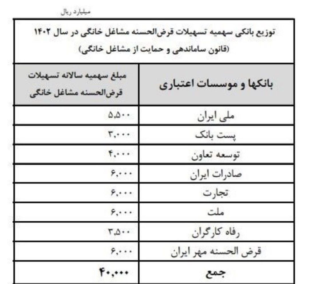 بانک مرکزی در بخشنامهای سهمیه تسهیلات قرض الحسنه مشاغل خانگی در سال ۱۴۰۲ را به بانکهای رفاه کارگران، توسعه تعاون، ملی ایران، صادرات ایران، تجارت، ملت، قرض الحسنه مهر ایران و شرکت دولتی پست بانک ابلاغ کرد.