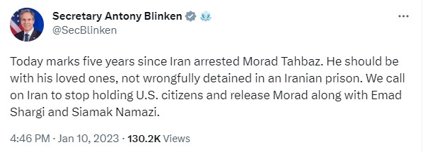 حمایت آنتونی بلینکن، وزیر امورخارجه آمریکا از طاهباز و درخواست آزادی او