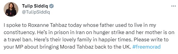 «تولیپ صدیق»، از نمایندگان پارلمان انگلستان، در توییتی به مظلومنمایی از مراد طاهباز پرداخت و خواستار حمایت عمومی برای آزادی او شد.