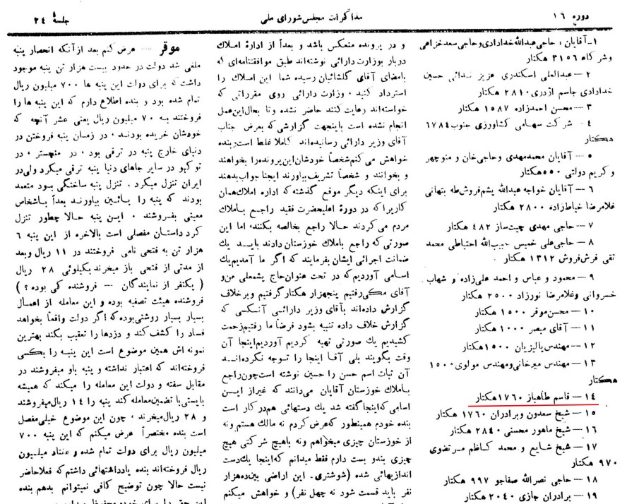 گزارش مجلس شورای ملی از غصب بیش از ۱۷۰۰ هکتار توسط قاسم طاهباز در دوران پهلوی