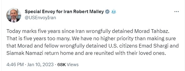 رابرت مالی، فرستاده ویژه آمریکا در امور ایران که میتوان گفت یکی از مهمترین نقشها را در تحریمهای اقتصادی ایران ایفا کرده است، در توییتی نوشت: «ما هیچ اولویتی بالاتر از این نداریم که مطمئن شویم مراد طاهباز و سایر شهروندان ایالات متحده، عماد شرقی و سیامک نمازی که به ناحق بازداشت شدهاند، به خانه بازگردند و به عزیزانشان بپیوندند.»