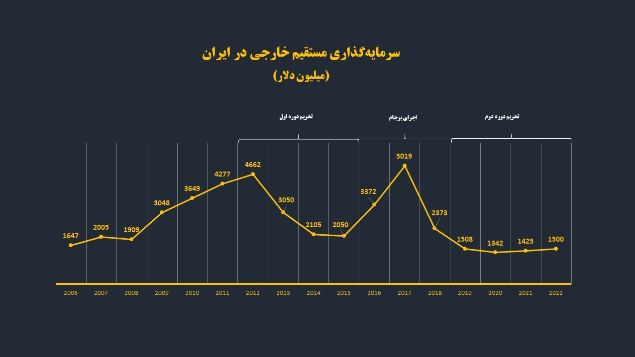 میزان سرمایهگذاری مستقیم خارجی در ایران در سال 2021 معادل 1 میلیارد و 425 میلیون دلار بود؛ یعنی میزان سرمایهگذاری خارجی در ایران در سال 2022 با افزایش (75 میلیون دلاری) 5 درصدی مواجه شده است.