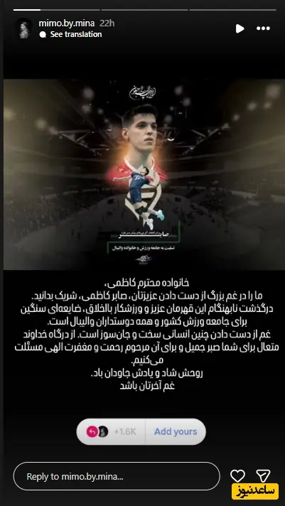 اقتصادایرانی: مینا مختاری، همسر بهرام رادان، با انتشار استوری درگذشت صابر کاظمی، ورزشکار ارزنده ایران را تسلیت گفت. در ادامه تصویر استوری این طراح مد را مشاهده کنید.