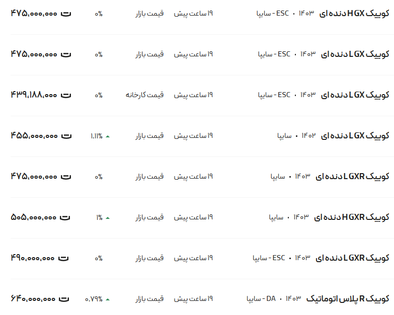 در ادامه، جزئیات مرتبط با قیمت مدلهای مختلف خودرو کوئیک سایپا را مشاهده میکنید: