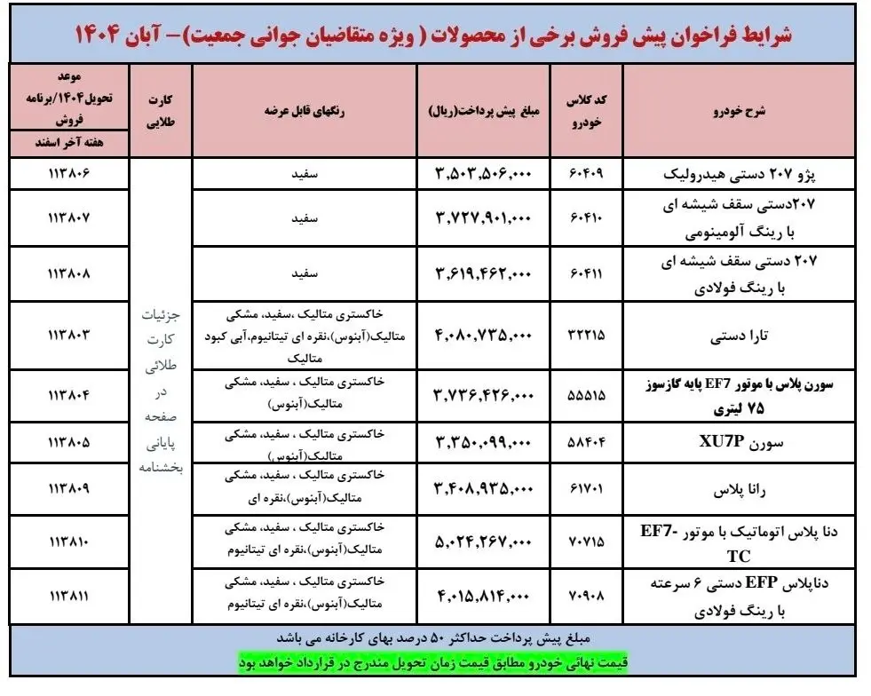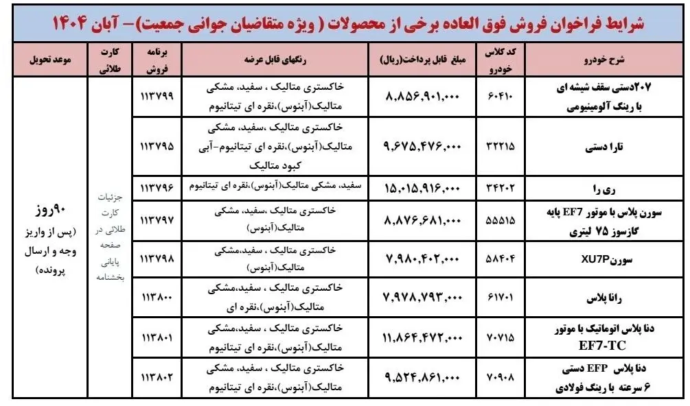 از جمله اطلاعات مهم این فراخوان شامل نوع خودروهای قابل ارائه، زمان تحویل، نحوه فروش و قیمت محصولات است. برای اطلاع بیشتر درباره جزئیات طرح، جدول زیر قابل بررسی است:
