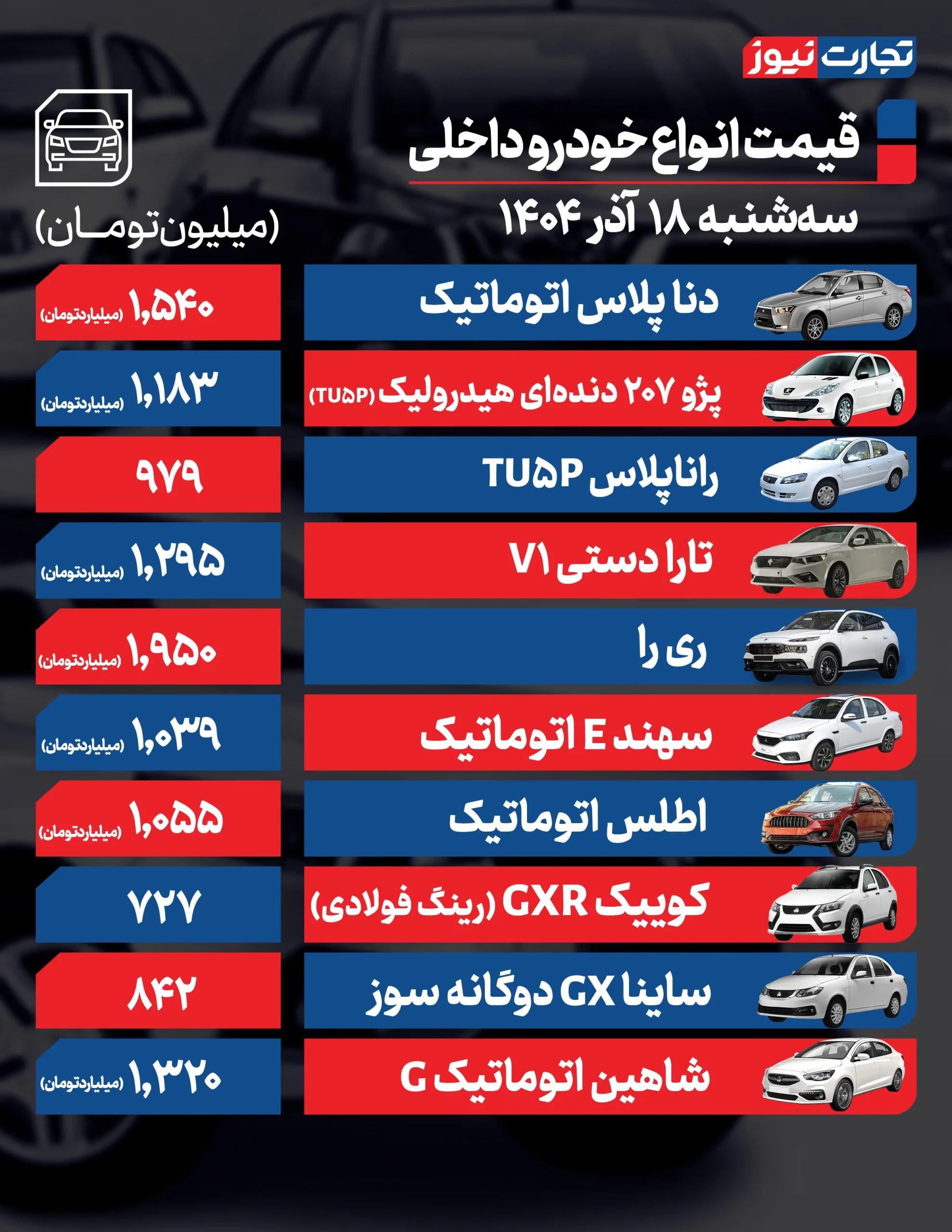 قیمت خودرو امروز سه شنبه 18 آذر 1404 +جدول