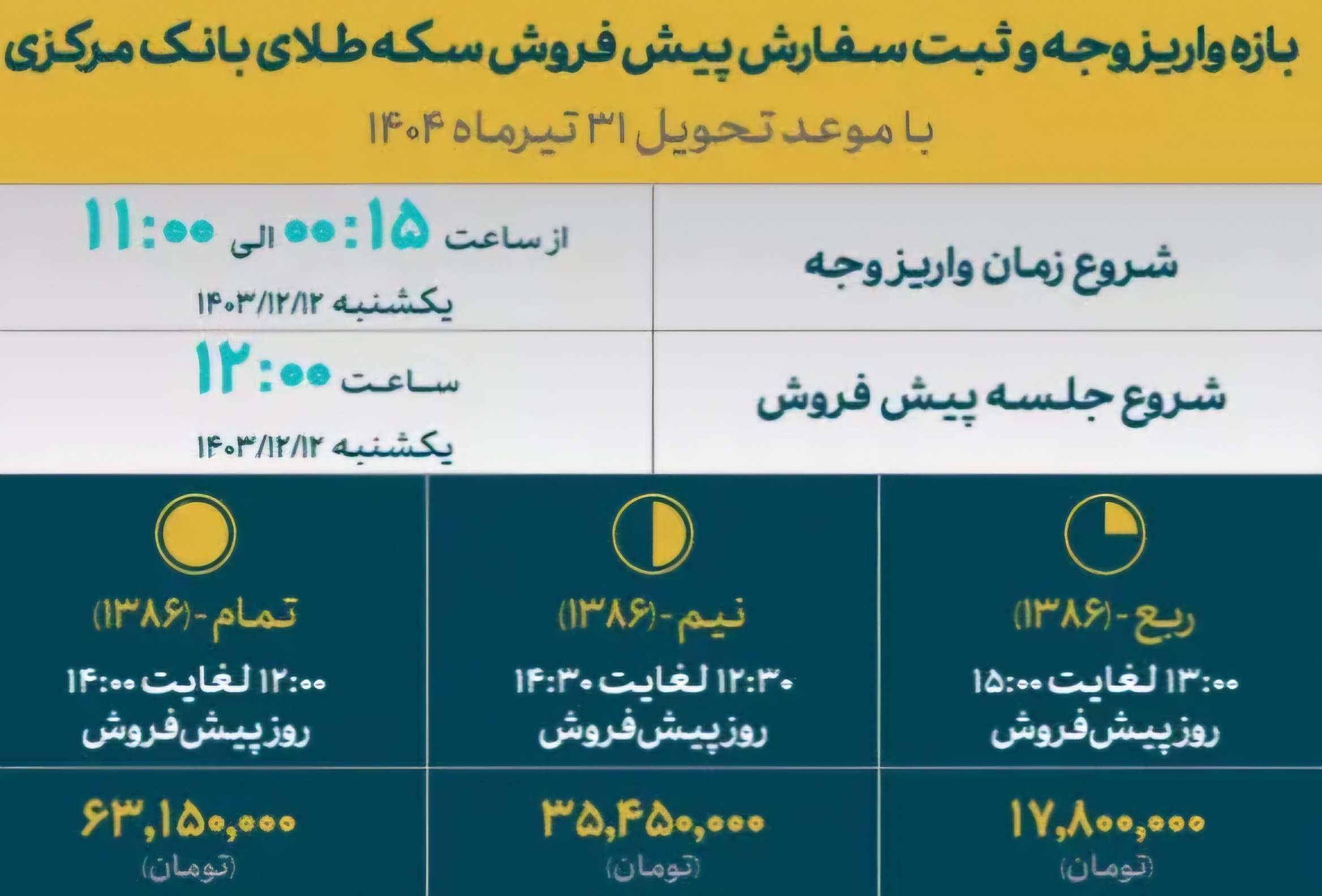 براساس شیوهنامه نحوه برگزاری دومین مرحله پیشفروش سکه طلا در مرکز مبادله ایران، موضوع دارایی پیشفروش انواع قطعات سکه طلای بانک مرکزی جمهوری اسلامی ایران از جمله تمام سکه، نیمسکه و ربعسکه با تاریخ ضرب سال ۱۳۸۶ است. شایان ذکر است، بازه ثبت سفارش پیشفروش سکه طلا با موعد تحویل تیرماه ۱۴۰۴، ساعت ۱۲ الی ۱۵ روز یکشنبه ۱۲ اسفندماه است. ساعت شروع جلسه رأس ساعت ۱۲ خواهد بود. ثبت سفارش تمام سکه از ساعت ۱۲ لغایت ۱۴، نیم سکه از ساعت ۱۲ و ۳۰ دقیقه لغایت ۱۴ و ۳۰ دقیقه و ربع سکه از ساعت ۱۳ الی ۱۵ امکانپذیر است.