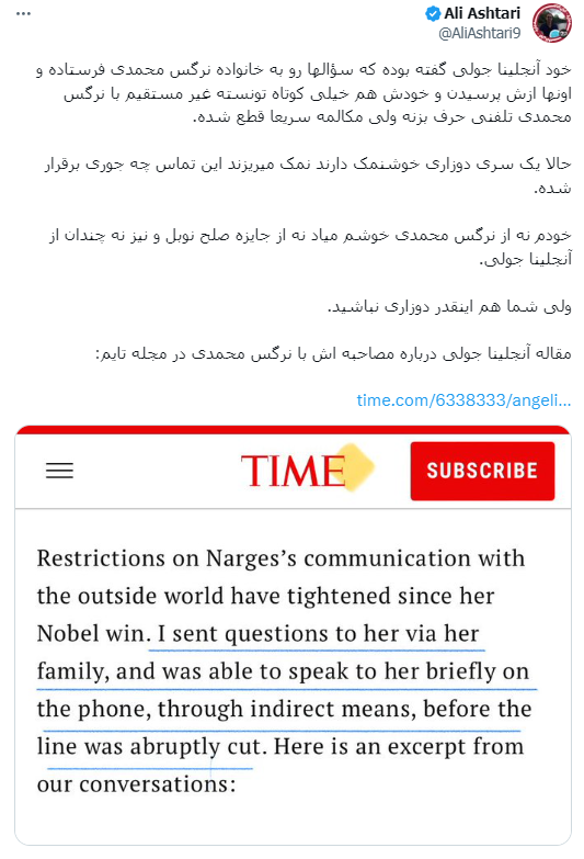 یکی دیگر از کاربران فضای مجازی ایکس بیان میکند: «گفتگوی تلفنی میان نرگس محمدی و آنجلینا جولی حاوی این پیام برای غرب است، که وضعیت حقوق زندانیان در ج ا، آنقدر هم بد نیست. اینگونه محمدی و جولی به نظام خدمت نمودند.»
