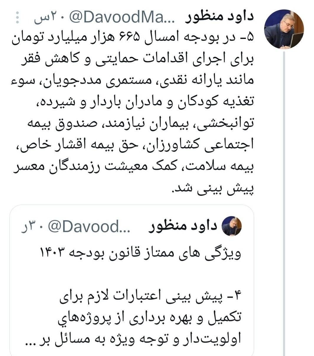 به گزارش اقتصاد100، داود منظور رئیس سازمان برنامه و بودجه در فضای مجازی نوشت: در بودجه امسال 665 هزار میلیارد تومان برای اجرای اقدامات حمایتی و کاهش فقر مانند یارانه نقدی، مستمری مددجویان، سوء تغذیه کودکان و مادران باردار و شیرده، توانبخشی، بیماران نیازمند، صندوق بیمه اجتماعی کشاورزان، حق بیمه اقشار خاص، بیمه سلامت، کمک معیشت رزمندگان معسر پیش بینی شد.