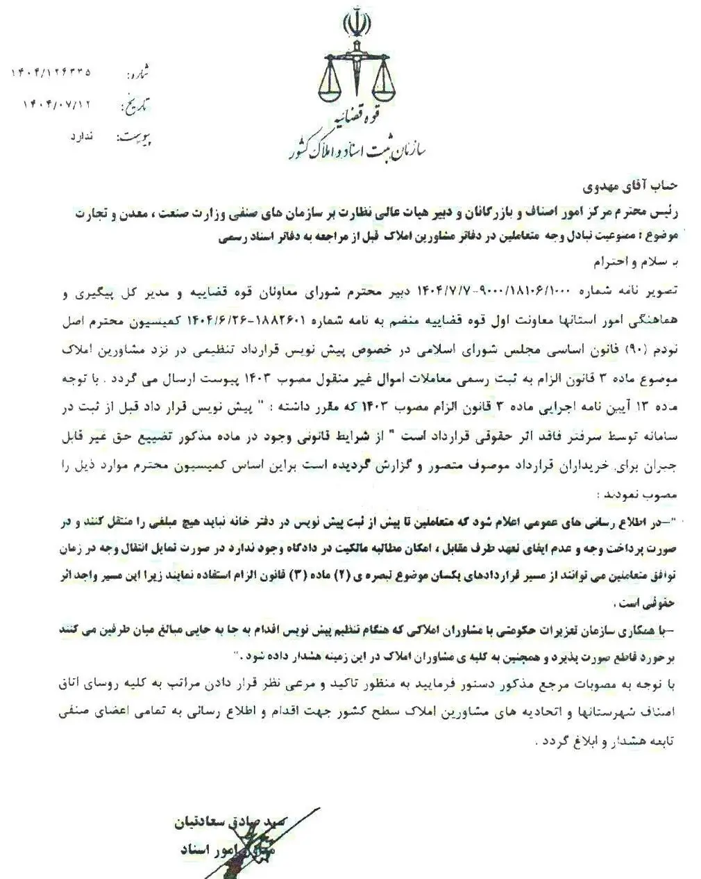 تصویر نامه شماره 9000/18106/1000 – 1404/7/7 از دبیر محترم شورای معاونان قوه قضاییه و مدیر کل پیگیری و هماهنگی امور استانها معاونت اول قوه قضاییه به همراه نامه شماره 1882601- 1404/6/26 از کمیسیون اصل نودم (90) قانون اساسی مجلس شورای اسلامی درخصوص پیشنویس قراردادهای تنظیمشده در دفاتر مشاورین املاک که در ارتباط با ماده 3 قانون الزام به ثبت رسمی معاملات اموال غیرمنقول مصوب 1403 است، ارسال شده است.