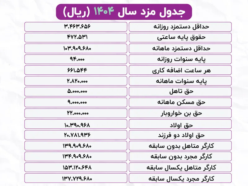 جدول حداقل حقوق و مزایا در سال ۱۴۰۴