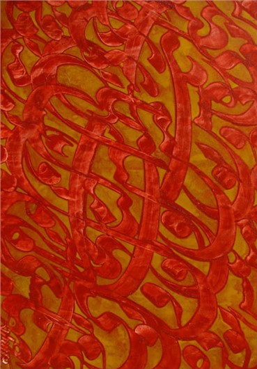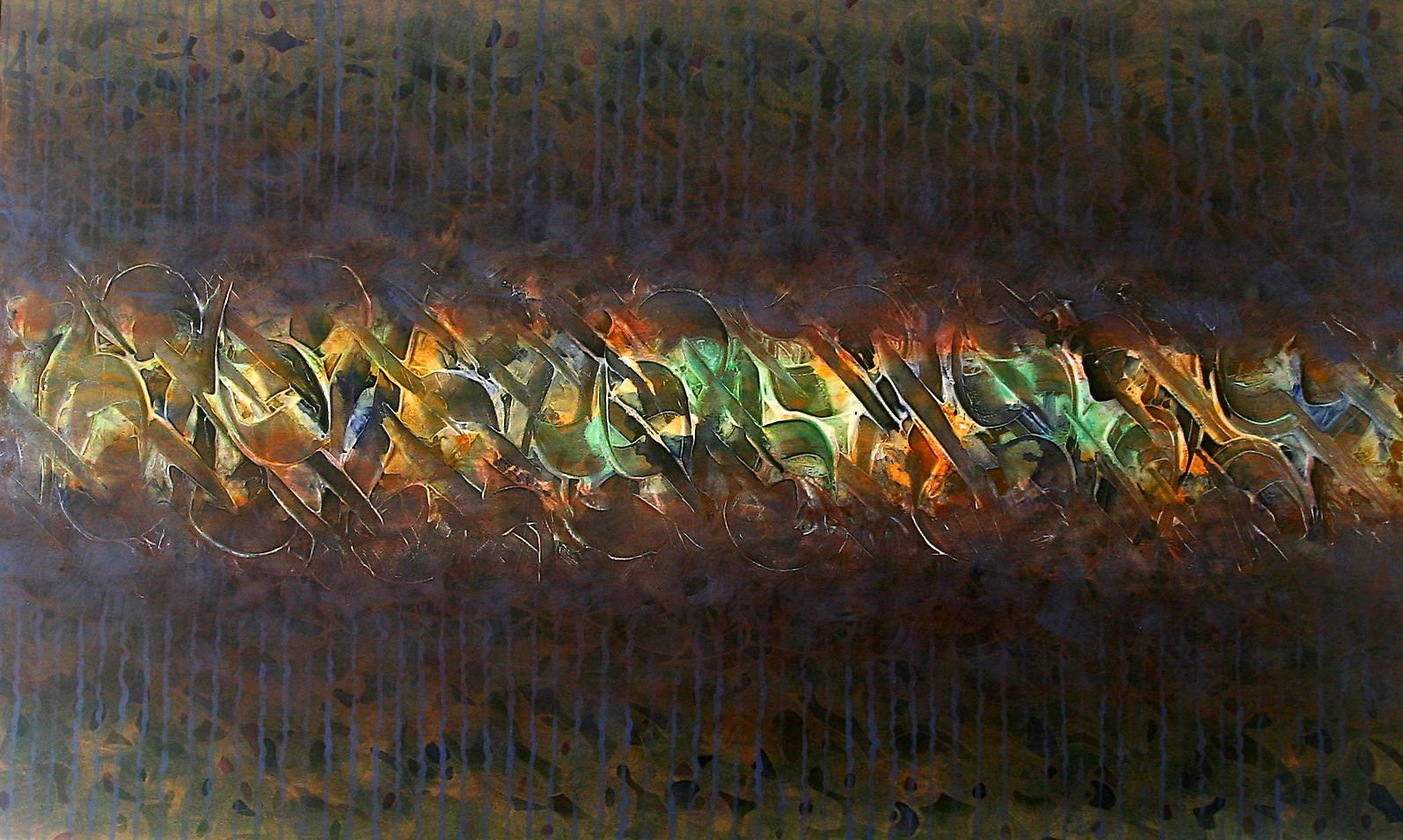 نمونهای از آثار نقاشیخط استاد کاشیان که قدرت این هنرمند را در استفاده از رنگ از یک سو و از سوی دیگر هنر خوشنویسی نشان میدهد