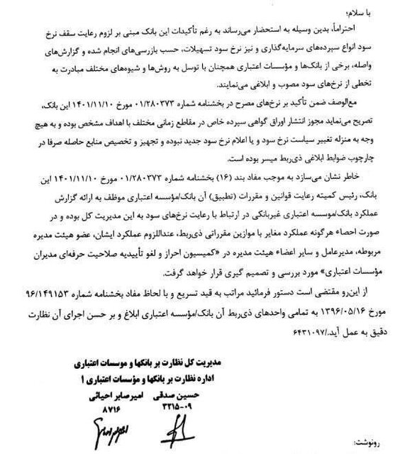 احتراما، بدین وسیله به استحضار می رساند به رغم تاکیدات این بانک مبنی بر لزوم رعایت سقف نرخ سود انواع سپرده های سرمایه گذاری و نیز نرخ سود تسهیلات، حسب بازرسی های انجام شده و گزارش های واصله، برخی از بانک ها و موسسات اعتباری همچنان با توسل به روش ها و شیوه های مختلف مبادرت به تخطی از نرخ های سود مصوب و ابلاغی می نمایند.