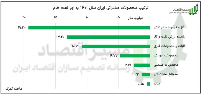در سال ۱۴۰۱ طبق آمار گمرک صادرات کشور (بدون نفت خام) معادل ۵۳ میلیارد دلار اعلام شد. ترکیب این صادرات از نظر دسته بندی محصولات به شرح زیر است: