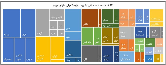 ۹۰ ردیف تعرفه، ارزش ۹۰ درصد صادرات غیرنفتی را در برمیگیرند. از این میان، ۶۳ ردیف تعرفه با ارزش ۷ میلیارد دلار، به دلیل نوع فروش دچار چالش در ارزشگذاری گمرکی هستند که در نمودار زیر آمده است: