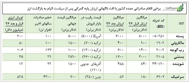 مطابق جدول فوق، اگر ارزشگذاری کالای صادراتی بعد از سال ۱۳۹۷ با همان شیوه قبل از سال ۱۳۹۷ انجام میشد، برآورد می شود صرفا در ۶ قلم کالای مذکور که به صورت تصادفی انتخاب شده است، سالانه بیش از ۹۰۰ میلیون دلار به آمار صادرات کشور افزوده میشد.