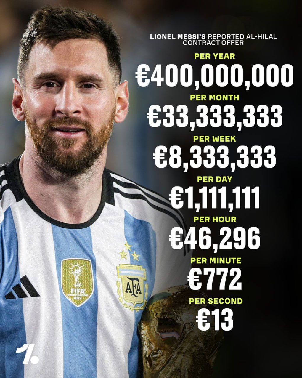 طبق اعلام رسانه های دنیا مسی در صورت انتقال به لیگ عربستان سالیانه ۴۰۰ میلیون یورو به جیب می زند.