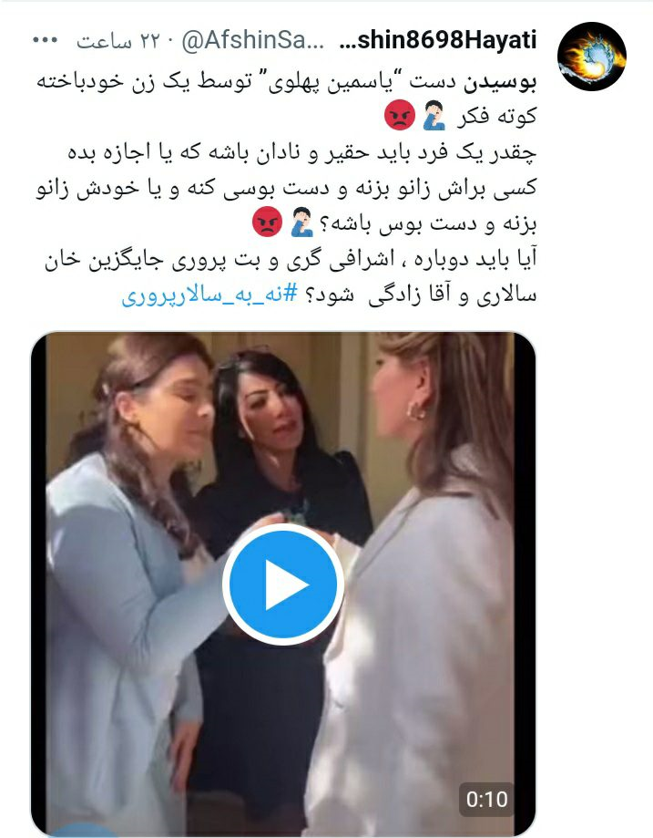 به گزارش اقتصاد100، به تازگی در فضای شبکههای اجتماعی فیلمی از بوسیدن دست «یاسمین پهلوی» منتشر شده که جنجال شدیدی به پا کرده است. در این فیلم یک زن به مانند خدمتکاران غربی جلوی عروس خانواده پهلوی تعظیم میکند و سپس دست وی را میبوسد. یاسمین پهلوی نیز که گویی منتظر این حرکت است از آن استقبال میکند.