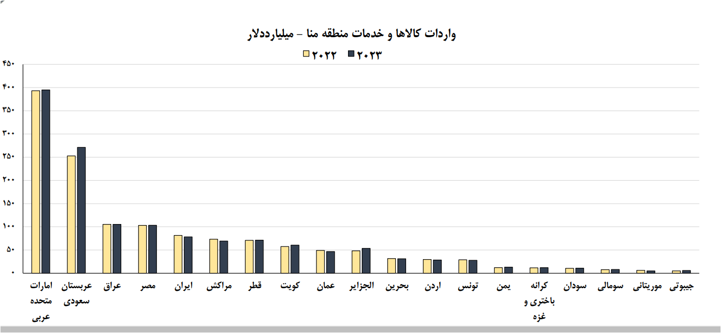 طبق دادههای موجود از بین 19 کشور منطقه منا اغلب با رشد واردات مواجه هستند. در مجموع نیاز وارداتی منطقه تا پایان 2023 برابر 1.4 هزار میلیارد دلار پیشبینی شده است که نشان از افزایش 20 میلیارد دلاری در سال جاری میلادی میدهد.