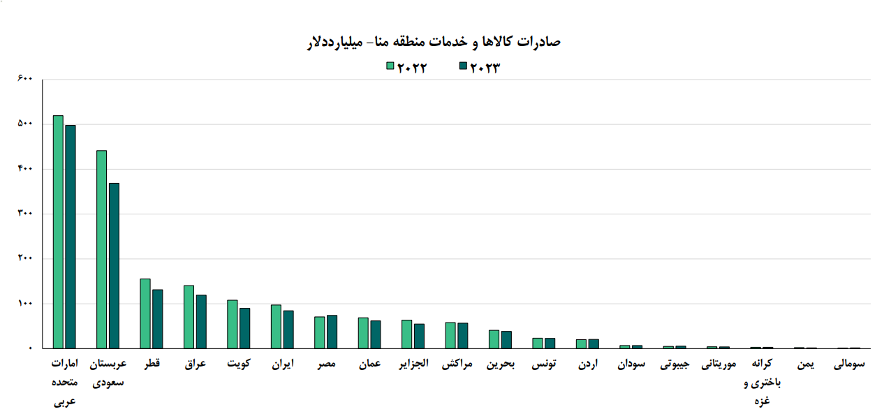 در مقابل رشد واردات منطقه با افت 190 میلیارد دلاری صادرات مواجه است. تا پایان سال 2023 پیش بینی میشود، صادرات منطقه به 1.8 هزار میلیارد دلار برسد.
